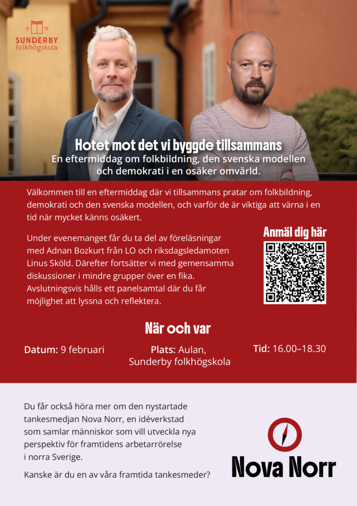 Du får också höra mer om den nystartade tankesmedjan Nova Norr, en idéverkstad som samlar människor som vill utveckla nya perspektiv för framtidens arbetarrörelse i norra Sverige. Kanske är du en av våra framtida tankesmeder?