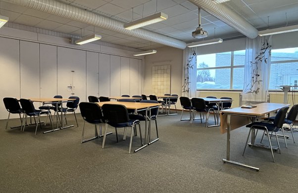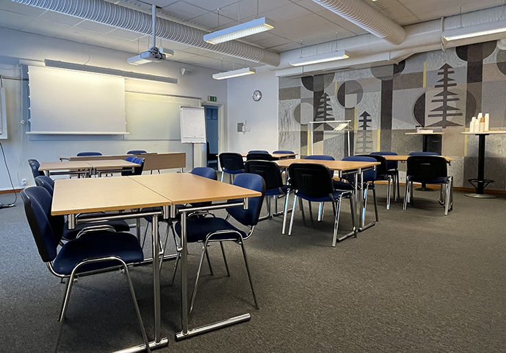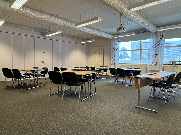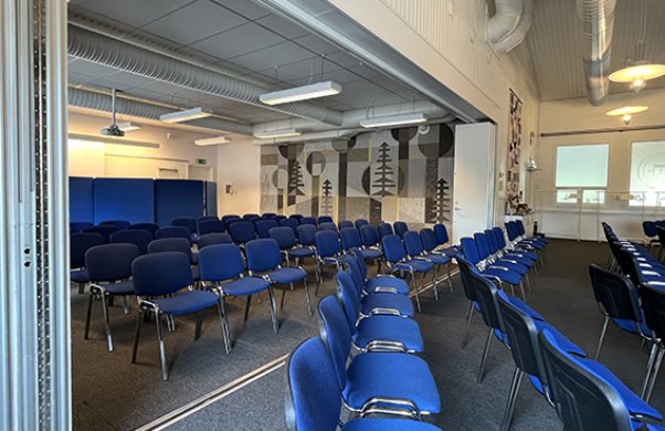 Lilla salen är granne med aulan och är en bra lokal för det lilla mötet eller som komplement till aulan. En enkel vikvägg skiljer de båda lokalerna åt.