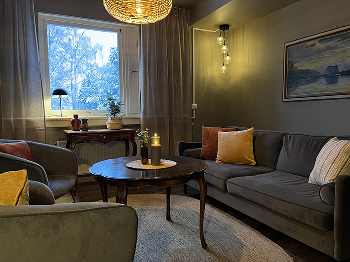 Välkommen till ett grupprum med vardagsrumskänsla! En plats för den lilla gruppen eller enskilda möten. Här sitter ni bekvämt i soffa och fåtölj, belysningen är dämpad och rummets design bjuder in till en lugn känsla. Vi tror att ett rum med vardagsrumskänsla ger förutsättningar för andra typer av möten.- Ni finner rummet en våning upp på vårt hotell.