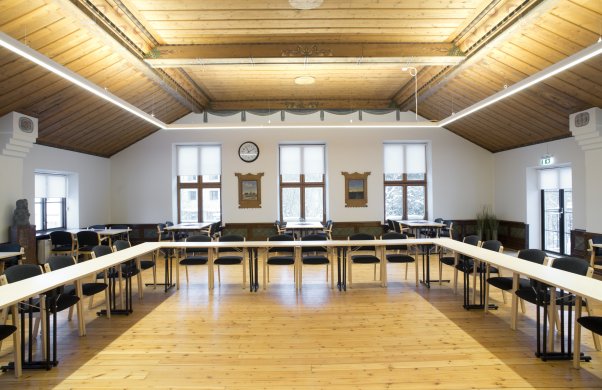 Här knarrar de gamla trägolven, stentrappan viskar om djur från förr och trädörrarna är charmigt rustika. På väggar och tak ses målningar från förr, men var inte oroliga även om lokalen är från tidigt 1900-tal så finns det modern teknik för ett uppkopplat möte.